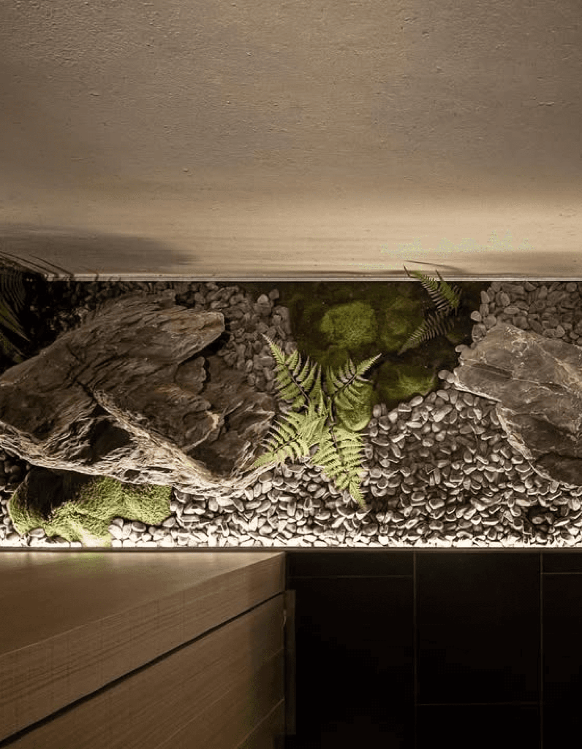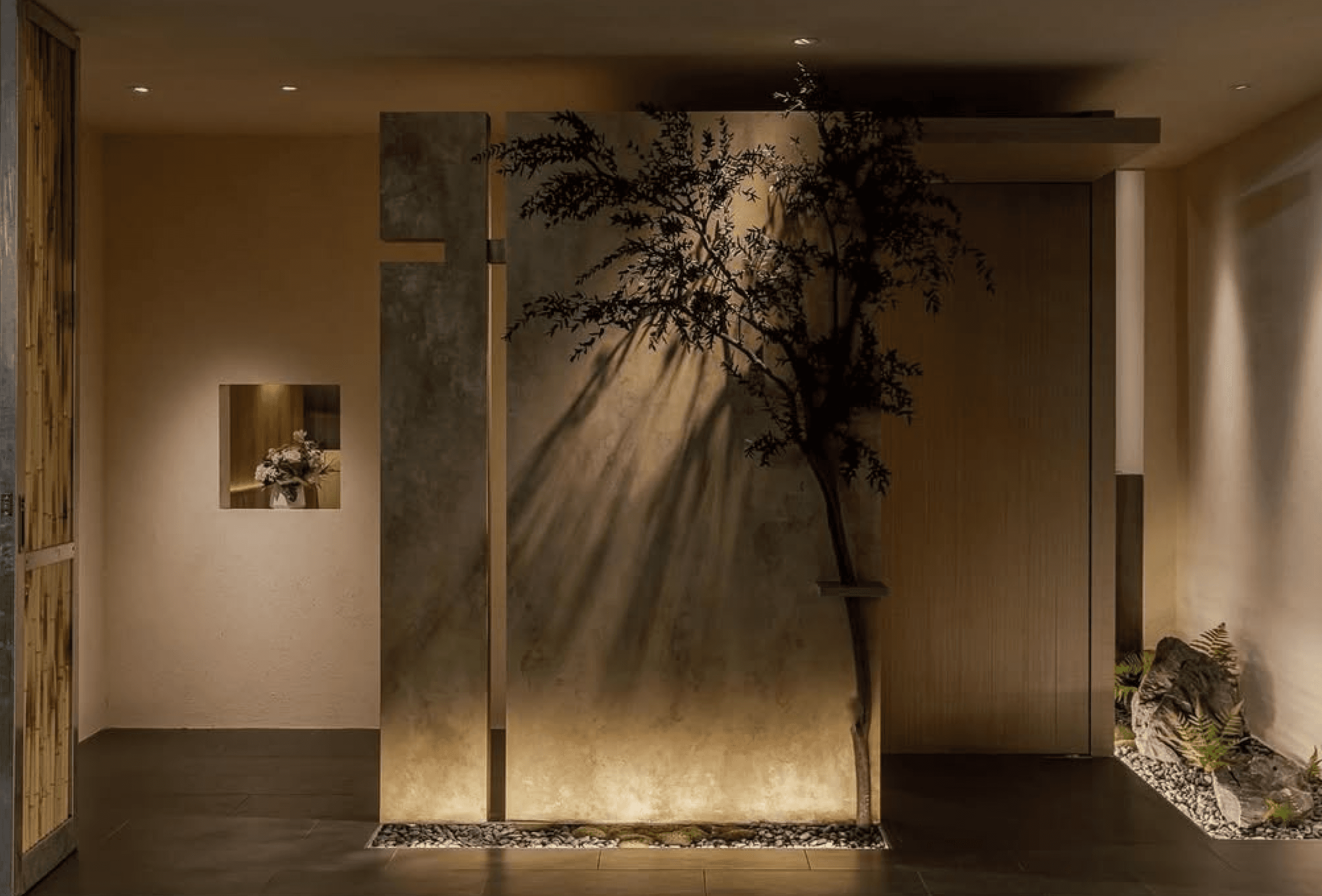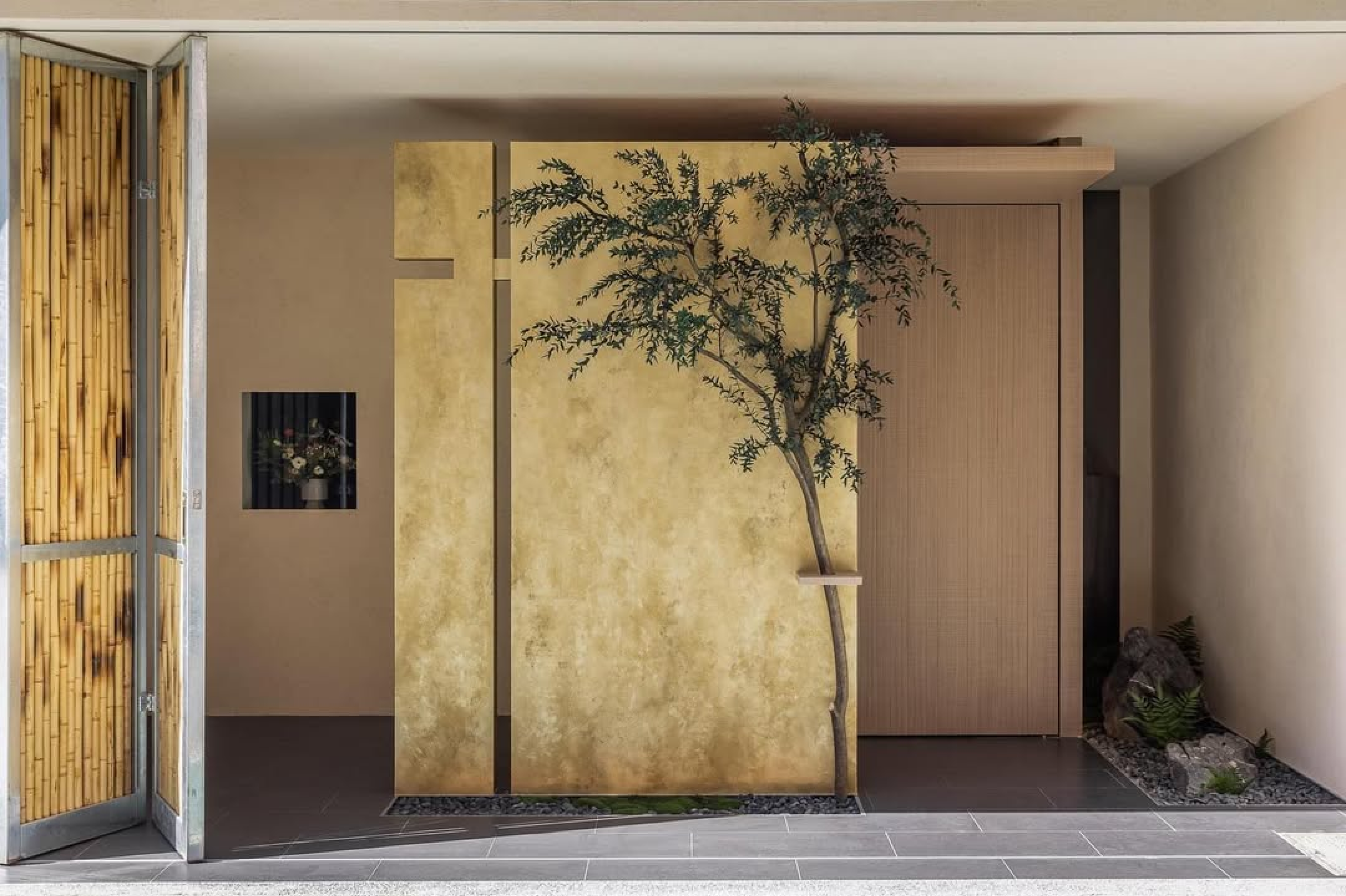 The design of the main door is inspired by Japanese gardens, with bamboo shadows intertwined in the greenery and moss-covered stones, exuding a tranquil aesthetic unique to nature and allowing the mind to find a moment of tranquility here.